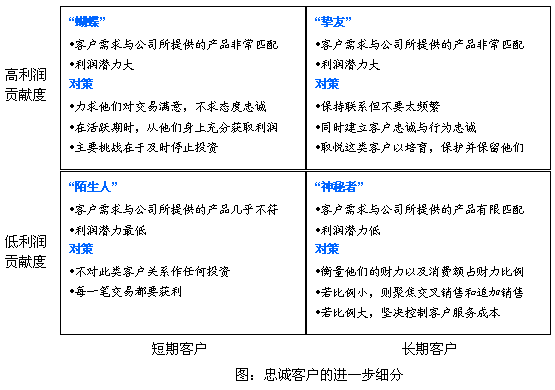 CRM廠商和業(yè)界普遍認為:只要贏得了客戶的忠誠,企業(yè)將"財源滾滾";因此企業(yè)在培養(yǎng)客戶忠誠方面的開支在逐步上升。因為從表面上看來,客戶滿意度、客戶忠誠度和客戶保留度越高,客戶利潤貢獻度就大。但事實并不如他們所愿,《哈佛商業(yè)評論》最新的論文,研究表明:客戶滿意度、客戶忠誠度與客戶利潤貢獻度的關(guān)聯(lián)程度比預(yù)期的要小得多。企業(yè)應(yīng)當(dāng)對忠誠客戶再進行細分,然后在更細化的客戶基礎(chǔ)上對其進行分類管理,并采取相應(yīng)的對策。在論文中,作者根據(jù)利潤貢獻度大小與客戶的短長期兩個維度,將忠誠客戶進行了深層次細分。主要分成四類:"蝴蝶"、"摯友"、"陌生人"、"神秘者"。企業(yè)應(yīng)該根據(jù)每一類的情況采取相應(yīng)的對策。管理那些能使企業(yè)盈利但不忠誠的客戶--"蝴蝶"--的關(guān)鍵是,在他們購物時盡可能地從他們身上獲利。對那些既能帶來利潤又忠誠的客戶--"摯友",細心呵護他們則更為恰當(dāng)。至于那些忠誠但不能帶來利潤的客戶--"藤壺",你需要做的是確定他們是否有增加消費的潛力。最后,對于"陌生人"--那些既不忠誠又沒有利潤可賺的客戶,答案當(dāng)然很簡單:早點認出他們,不對他們做任何投資。