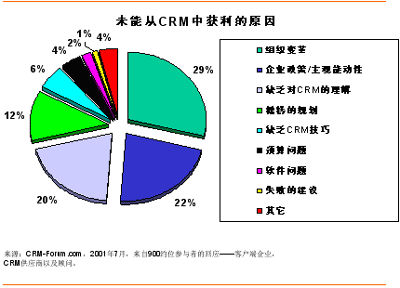 但成功只會擁抱那些能夠“正確執(zhí)行”的人,而不是任何一個搭上CRM順風(fēng)船的企業(yè)。2001年7月,CRM-Forum.com出版了一份關(guān)于未能從CRM中獲利原因的報(bào)告。從搜集到的來自CRM開拓者的約900個回應(yīng)來看——客戶端企業(yè),CRM供應(yīng)商以及顧問,組織變革及企業(yè)政策/主觀能動性占了50%以上的失敗原因;緊隨其后的各個因素包括缺乏對CRM的理解(20%)和糟糕的規(guī)劃(12%)。下面讓我們就CRM方法論的選擇對這些因素作一番考察吧。