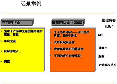 在評估當(dāng)前情況與遠(yuǎn)景,資源需求,癥結(jié),極限以及鋪就路標(biāo)和里程碑的關(guān)系時(shí),實(shí)施展望和差距分析會議是十分重要的。取決于你對CRM遠(yuǎn)景的定義——無論是它將成為一個能夠給你一把競爭利刃的企業(yè)策略 (類似的例子有Citicorp,Dell,F(xiàn)ord Motors) 或僅僅只是一個讓你更出眾的營銷項(xiàng)目——這邁出的第一步在你選擇CRM方法論的過程中都必將起到舉足輕重的作用。一個核心的方法論必須能夠支持企業(yè)大部分的業(yè)務(wù)和流程需求,如MIS;客戶體驗(yàn)管理;接觸點(diǎn)管理;收益率管理等等。
