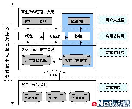 從上面的分析型CRM體系結(jié)構(gòu)圖可以看出,整個架構(gòu)分為數(shù)據(jù)源層、數(shù)據(jù)存儲層、應(yīng)用支持層和用戶交互層總共四層。數(shù)據(jù)源層包括了企業(yè)常用信息系統(tǒng)和一些外部系統(tǒng)的數(shù)據(jù)源,比如涉及到客戶交互的一些交易系統(tǒng),服務(wù)系統(tǒng),各系統(tǒng)間的客戶數(shù)據(jù)是分散的,而且可能重合,出現(xiàn)不一致的問題;數(shù)據(jù)存儲層是為了整個企業(yè)有集中統(tǒng)一的客戶視圖,通過從各源系統(tǒng)抽取數(shù)據(jù),進(jìn)行整合后的數(shù)據(jù)倉庫,而且在客戶數(shù)據(jù)倉庫的基礎(chǔ)上,可以建立相關(guān)分析之用的客戶主題數(shù)據(jù)集市;應(yīng)用支持層除了支持復(fù)雜,智能化報(bào)表查詢外,還支持OLAP分析,提供數(shù)據(jù)挖掘功能;用戶交互層提供分析和挖掘結(jié)果同企業(yè)管理、決策層和企業(yè)其它服務(wù)人員和客戶的交互,形成反饋機(jī)制,從而有效地利用分析和挖掘得到的有用知識。