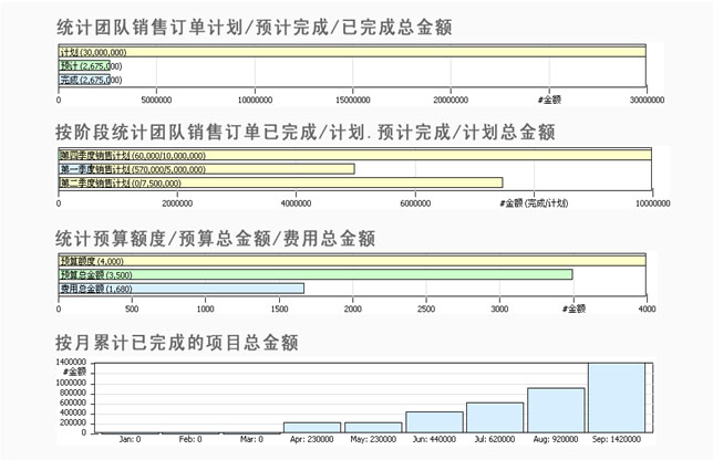 在VamCRM項(xiàng)目組合管理中集成項(xiàng)目數(shù)據(jù)的統(tǒng)計(jì)與分析,可以直接監(jiān)控項(xiàng)目計(jì)劃、預(yù)計(jì)及完成的項(xiàng)目數(shù)量、總金額和費(fèi)用的統(tǒng)計(jì),也可按月累計(jì)已完成的項(xiàng)目數(shù)量、總金額和費(fèi)用,直接衡量項(xiàng)目實(shí)施的結(jié)果與效益。在費(fèi)用管理模塊中集成費(fèi)用數(shù)據(jù)的統(tǒng)計(jì)與分析,對(duì)于所有費(fèi)用可以按人及費(fèi)用類型進(jìn)行統(tǒng)計(jì),實(shí)時(shí)知道哪一個(gè)人或哪一類費(fèi)用開銷最多,以及費(fèi)用與預(yù)算的對(duì)比分析。