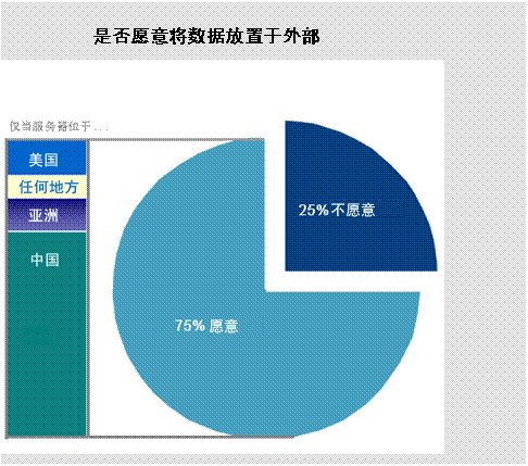 在所有被調(diào)查者中,明確表示不愿意將數(shù)據(jù)放置于托管服務(wù)器比例相對(duì)較低,只有25%的被調(diào)查者認(rèn)為他們不愿意將公司數(shù)據(jù)放置于外部托管服務(wù)器。