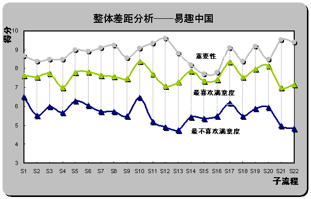 2) 重要流程欠缺最優(yōu)體驗。雖然易趣中國被認為是最不喜歡的在線銷售網(wǎng)站,但從滿意度評分也同時可以發(fā)現(xiàn),易趣中國在S1(瀏覽速度),S16(個人定制促銷信息的發(fā)布)和S15(個性化頁面設置)還是為用戶設計了相對較好的體驗。但重要性得分排名前三位的子流程中,S12(產(chǎn)品質量可靠)、S21(退換貨服務)和S22(客戶投訴和反饋)仍為重要性與滿意度差距最大的三個子流程,易趣中國也未在重要流程上為用戶設計優(yōu)越的在線體驗。