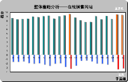 。2)整體差距分析(Gap Analysis)。請見上圖X軸下方所示,計算所有被調查對所列在線銷售網(wǎng)站的滿意度平均值(綜合最喜歡在線銷售網(wǎng)站和最不喜歡在線銷售網(wǎng)站的滿意度,計算被調查者對22個子流程的滿意度評分)。通過計算重要性和滿意度的差距,首先,一個有趣的現(xiàn)象,在著色的三個差距最大的子流程剛好也是重要性得分排名前三位的流程S12,