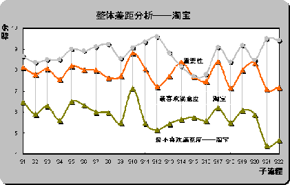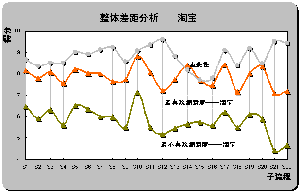 S12(產(chǎn)品質量可靠)和S22(客戶投訴和反饋),具體差距分別為2.44,2.38和2.22。也是重要性評分排名前三位的子流程。雖然淘寶成為用戶最喜歡的在線銷售網(wǎng)站,但在重要子流程上并未為用戶設計最佳體驗。