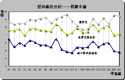 從前面分析可知,易趣以19.77%的比例成為最不喜歡在線銷售網(wǎng)站,選擇被調查者對子流程評分——最喜歡、最不喜歡在線銷售網(wǎng)站滿意度曲線與重要性曲線進行差距分析。