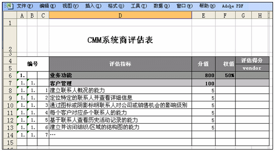 CMM體系中的標準并非在每一次評估中都需要用的,它實際上是一個滿足大部分CRM評估的標準的合集。所以應(yīng)用者首先要自己或者借助評估顧問來選擇CMM指標范圍,確定哪些指標參與此次評估。