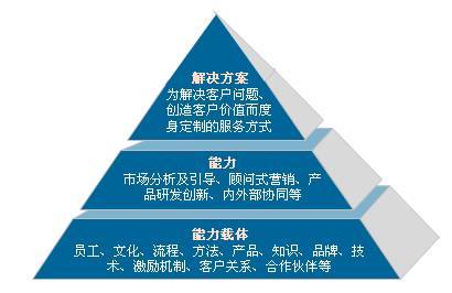 解決方案導(dǎo)向型企業(yè)在整個(gè)經(jīng)營(yíng)過(guò)程中積極倡導(dǎo)上述觀念,并在向客戶的服務(wù)過(guò)程中身體力行,這需要企業(yè)具備哪些核心的能力,這些能力又該如何獲取呢?看看下圖中的解決方案型企業(yè)能力金字塔: