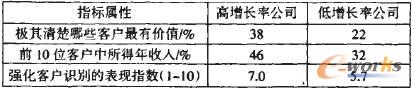 對《財富》雜志排名前l(fā)000位公司的200位經(jīng)理調(diào)查后得出結(jié)論,企業(yè)增長性與清楚的識別客戶有明顯的聯(lián)系(見表1)。該表反映了高增長率的企業(yè)比低增長率的企業(yè)更加懂得客戶識別的重要性,并運用技巧來強(qiáng)化核心客戶為企業(yè)創(chuàng)造更多價值。
