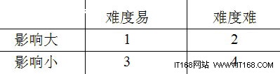 如果CRM項(xiàng)目的規(guī)模比較大,如涉及到集團(tuán)型或者項(xiàng)目集成的業(yè)務(wù),那么可以對(duì)以上的圖表進(jìn)行進(jìn)一步細(xì)化,以實(shí)現(xiàn)對(duì)需求的精細(xì)化管理。如可以將難度分為簡(jiǎn)單、中等、困難、暫時(shí)不考慮等幾個(gè)類(lèi)別。同時(shí)可以將影響成果,也分為大、中、小等三個(gè)級(jí)別。具體要?jiǎng)澐譃槎鄠(gè)檔次,主要是根據(jù)需求的個(gè)數(shù)來(lái)說(shuō)的。如筆者在實(shí)際項(xiàng)目中,如果需求的個(gè)數(shù)少于100個(gè),那么使用兩個(gè)級(jí)別基本上可以滿(mǎn)足了。如果需求個(gè)數(shù)超過(guò)100、少于300,那么可以再增加一個(gè)級(jí)別,以此類(lèi)推。