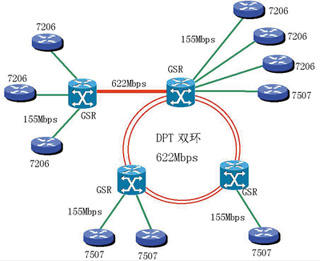 Switch Router 12000), 其中三個(gè)GSR之間采用Cisco的動(dòng)態(tài)IP光纖傳輸技術(shù)DPT,采用兩個(gè)STM-4光纖環(huán)連接,利用SRP技術(shù),使得STM-4在兩個(gè)環(huán)上實(shí)現(xiàn)負(fù)載均衡,這樣,主干網(wǎng)絡(luò)連接可以實(shí)現(xiàn)自我冗余保護(hù),保證網(wǎng)絡(luò)主干連接在其中一條出現(xiàn)故障時(shí),另外一條可以在很短的時(shí)間內(nèi)(<50ms)接管數(shù)據(jù)負(fù)載。另一個(gè)GSR與DPT環(huán)之間采用STM-4的POS接口相連接。