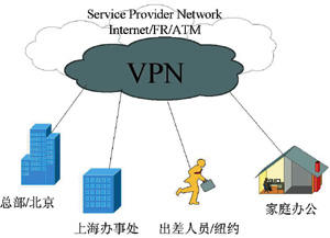 在如圖2所示的VPN 示意圖中,可以看出,VPN所賴以運(yùn)行的公網(wǎng)平臺(tái)可以包括各種實(shí)際的網(wǎng)絡(luò),例如IP網(wǎng)、幀中繼網(wǎng)、ATM網(wǎng),也可以就是因特網(wǎng)(Internet),因而也表明其網(wǎng)絡(luò)的范圍可以包括多個(gè)服務(wù)商。從地理范圍上看,VPN可以延伸到所有互相聯(lián)網(wǎng)的服務(wù)商所覆蓋的范圍。從用戶接入方式看,VPN可以包括服務(wù)商所提供的所有接入方式,如專線接入、撥號(hào)接入、無線連接等。
