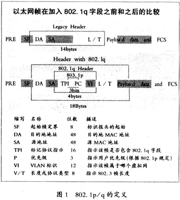 Identifier,虛擬網(wǎng)標(biāo)識(shí))位識(shí)別傳送的幀究竟屬于哪一個(gè)虛網(wǎng)。VI位共有12位,最大可以支持的虛網(wǎng)個(gè)數(shù)不會(huì)超過(guò)4096個(gè)。 802.1p/q的具體定義可以參見(jiàn)圖1。
