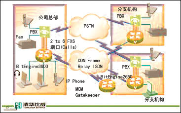 利用清華比威BitEngine系列路由器產(chǎn)品提供的VoIP(Voice over IP)支持,以及該產(chǎn)品具有的安全、加密、QoS、路由等特性,通過將長話旁路到數(shù)據(jù)網(wǎng)上,為企業(yè)節(jié)省大量的長話費(fèi)用開銷,同時(shí)利用豐富的接口,同原有的交換機(jī)相連,有效保護(hù)了企業(yè)原先的投資繼續(xù)有效。本方案中,使用清華比威的BitEngine2650/3600路由器實(shí)現(xiàn)企業(yè)間數(shù)據(jù)業(yè)務(wù)和語音業(yè)務(wù)的融合,BitEngine系列路由器提供了完善的QoS保證機(jī)制(支持PQ/WFQ/CBWFQ/WRED等多種隊(duì)列方式),確保語音數(shù)據(jù)的優(yōu)先處理。