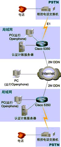 組成這個IP電話的網(wǎng)絡(luò)系統(tǒng)由處于兩個不同國家的區(qū)域組成(見附圖1網(wǎng)絡(luò)拓?fù)浣Y(jié)構(gòu)),每個區(qū)域都采用了一臺Cisco 5350路由器(以下簡稱5350)作為網(wǎng)絡(luò)的核心,這臺5350路由器具有兩個WAN口和兩個以太網(wǎng)口,能夠直接連接到本地的局域網(wǎng)和DDN基帶調(diào)制解調(diào)器。和普通電話網(wǎng)絡(luò)(PSTN)相連接則是通過添加一個E1接口卡4PRI和一個IP語音數(shù)據(jù)處理單元NP60,來實現(xiàn)E1(30條ISDN的B信道)和路由器相連接,實時地對語音數(shù)據(jù)進行H.323壓縮編碼。