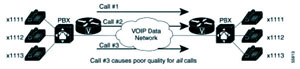 網(wǎng)絡(luò)中,話音網(wǎng)關(guān)路由器并不了解網(wǎng)絡(luò)中的狀況,包括:網(wǎng)絡(luò)的鏈路資源是否已經(jīng)飽和及網(wǎng)絡(luò)延遲,丟包率和網(wǎng)絡(luò)抖動等參數(shù)是否可以滿足話音應(yīng)用的需求。如果在不能夠保證網(wǎng)絡(luò)可以提供足夠的資源保證話音質(zhì)量的情況下,建立新的通話鏈路可能影響已經(jīng)建立的鏈路,或者是降低所有的通話話音質(zhì)量。如圖三,如果廣域網(wǎng)的帶寬只能容納兩個語音的呼叫,第三個呼叫的建立會導致所有的呼叫質(zhì)量下降。在這種情況下,拒絕呼叫的建立好過建立一條沒有質(zhì)量保證的鏈路。