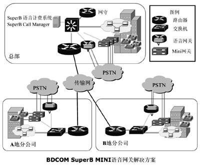 根據(jù)西北石油公司各地分公司電話全部是PSTN直線電話,沒有單位內(nèi)部的PBX,不能通過語(yǔ)音網(wǎng)關(guān)把這些直線電話統(tǒng)一接入到IP網(wǎng)絡(luò)上這一實(shí)際情況,方案提供方博達(dá)公司提供了一款小型BDCOM SuperB Mini語(yǔ)音網(wǎng)關(guān),來(lái)解決PSTN程控電話統(tǒng)一接入IP語(yǔ)音網(wǎng)絡(luò)的問題。使用BDCOM SuperB Mini并結(jié)合西北石油公司組建的企業(yè)內(nèi)部VoIP網(wǎng)絡(luò),克服了傳統(tǒng)語(yǔ)音網(wǎng)關(guān)解決方案的不足和缺點(diǎn)。