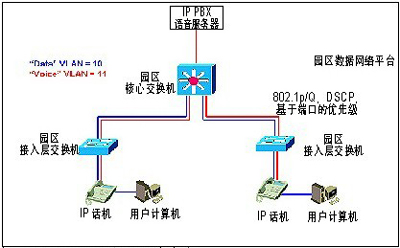 目前各個廠商的系列IP話機均提供2個以太網(wǎng)端口,一個連接網(wǎng)絡(luò)交換機,一個可以連接用戶PC,與網(wǎng)絡(luò)交換機連接端口支持802.1Q/p,可以實現(xiàn)IP語音和用戶PC劃歸不同的VLAN,而且IP語音包會帶上第二層和第三層的優(yōu)先級標(biāo)記,可以和客戶具有QoS支持的數(shù)據(jù)網(wǎng)絡(luò)平臺結(jié)合,提高IP話音質(zhì)量。