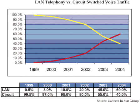 Group的資料顯示,LAN Telephone與Circuit Switched Voice Traffic比較圖,呈現(xiàn)數(shù)據網絡的占有率將在二至三年后,首度超越語音網絡的流量占有率。因此,不論是盤據傳統(tǒng)電信市場大廠如Lucent及Nortel,或是代表網絡新興勢力的Cisco,也都在積極爭搶這塊新領域的主導權。于是,有人說,「IP