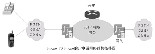 雖然從方式上看,IP話音業(yè)務(wù)包括了Phone TO Phone、PC TO Phone及PC TO PC三種方式,但是國內(nèi)主流的IP電話網(wǎng)絡(luò)仍然是以Phone TO Phone方式進(jìn)行,其網(wǎng)絡(luò)拓?fù)浣Y(jié)構(gòu)如圖所示。
