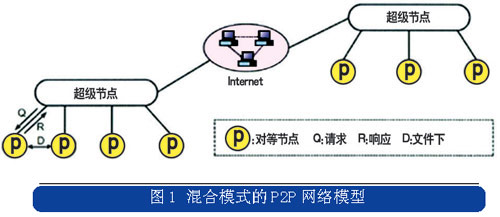 Skype是P2P技術(shù)演進(jìn)到混合模式后的典型應(yīng)用,它結(jié)合了集中式和分布式的特點(diǎn),在網(wǎng)絡(luò)的邊緣節(jié)點(diǎn)采用集中式的網(wǎng)絡(luò)結(jié)構(gòu),而在超級節(jié)點(diǎn)之間采用分布式的網(wǎng)絡(luò)結(jié)構(gòu),混合模式的P2P網(wǎng)絡(luò)模型如圖1所示。