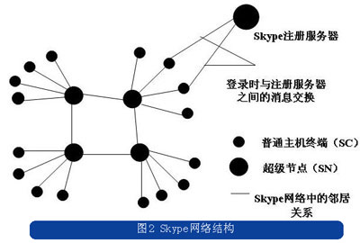 與常規(guī)的電信業(yè)務(wù)網(wǎng)絡(luò)不同的是,Skype的網(wǎng)絡(luò)中除了注冊服務(wù)器,沒有其他任何集中的服務(wù)器,只是將用戶節(jié)點(diǎn)分為普通節(jié)點(diǎn)和超級節(jié)點(diǎn)。Skype的系統(tǒng)連接結(jié)構(gòu)如圖2所示。