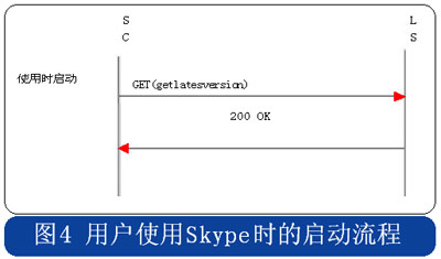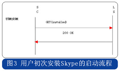 Skype的用戶終端啟動時,采用HTTP協(xié)議連接到注冊服務(wù)器,用戶初次安裝的啟動流程中攜帶“installed”的參數(shù),使用時啟動流程則在消息中攜帶“getlatestversion”參數(shù),具體流程分別見圖3和圖4。