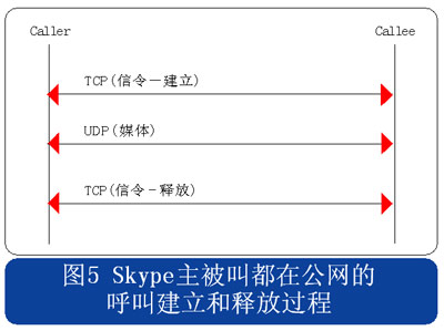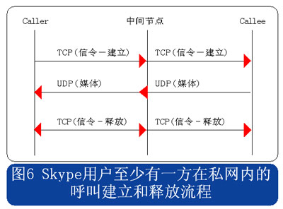 從上述流程圖可見,Skype的呼叫信令都采用TCP封裝,而媒體流則使用UDP封裝,當(dāng)有任何一方用戶位于限制UDP包的防火墻內(nèi)時,媒體流就會采用TCP封裝。另外當(dāng)Skype用戶至少有一方位于私網(wǎng)內(nèi)時,所有的信令和媒體消息都經(jīng)過一個或多個中間節(jié)點(diǎn)轉(zhuǎn)發(fā)。此時無需擔(dān)心用戶通話的媒體流因?yàn)榻?jīng)過中間節(jié)點(diǎn)轉(zhuǎn)發(fā)而被竊聽,因?yàn)镾kype采用了對消息進(jìn)行端到端加密的機(jī)制。