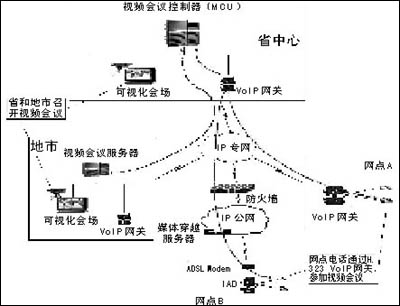 通過在全省部署VoIP系統(tǒng),網點VoIP網關可以通過H.245協(xié)議與視頻會議MCU(多點控制器)進行通信能力的動態(tài)協(xié)商,在國家、省和地市召開視頻會議時,網點可以通過普通電話(或者電話會議終端)參與會議,實現(xiàn)“聽聲參會”,低成本地實現(xiàn)了行業(yè)視頻會議系統(tǒng)的延伸。