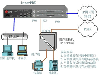 根據(jù)電話交換機的配置和功能不同,電話交換機與 interPBX設(shè)備的連接方式有二種常見方式,下面結(jié)合示意圖來具體說明。