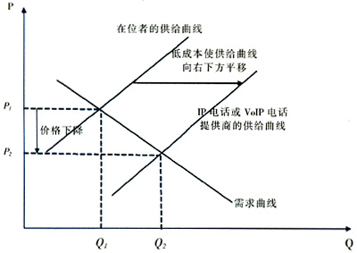 與傳統(tǒng)以電路交換為主的電話網(wǎng)相比,分組交換技術(shù)使得提供IP電話或VoIP電話所需的交換設(shè)備數(shù)量大大減少,而且部分提供IP電話或VoIP電話的運(yùn)營商并沒有鋪設(shè)上下行用戶端的“最后一公里”線路。由于沒有全程布網(wǎng),在網(wǎng)間結(jié)算費(fèi)較低甚至不結(jié)算的情況下,其運(yùn)營成本自然遠(yuǎn)低于本地運(yùn)營商,從而使其供給曲線與本地運(yùn)營商的供給曲線相比向右下方偏移,因而有能力推出價(jià)格遠(yuǎn)低于傳統(tǒng)語音的IP電話或VoIP電話,見圖2。