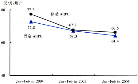 圖4 2004-2006年固定電話與移動電話的ARPU對比
