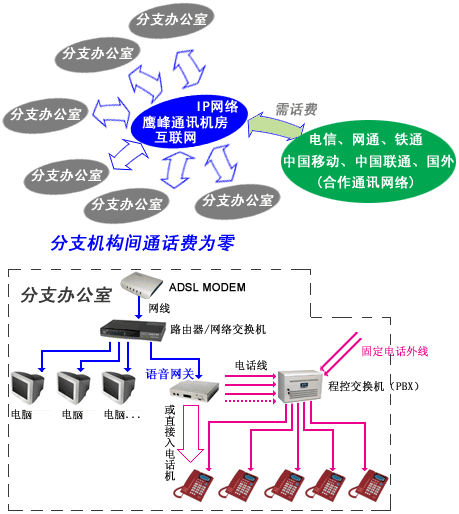 針對(duì)以上現(xiàn)狀,鷹峰NGN組網(wǎng)方案協(xié)助A公司在中國總部進(jìn)行了周密的分析與考察并就相關(guān)的產(chǎn)品技術(shù)進(jìn)行了深入的研究與探討,提供了以A公司在中國現(xiàn)有數(shù)據(jù)專網(wǎng)為基礎(chǔ)的,融合語音通信的解決方案,這是一套充分利用A公司現(xiàn)有數(shù)據(jù)網(wǎng)絡(luò)資源優(yōu)勢(shì),可行、先進(jìn)、完整的企業(yè)VoIP通信解決方案。將最終以A公司目前在中國所有機(jī)構(gòu)為結(jié)點(diǎn),組成在中國的VoIP網(wǎng)絡(luò)。方案匯集了鷹峰通訊所有最新PBX/語音網(wǎng)關(guān)及網(wǎng)絡(luò)通訊技術(shù)及設(shè)備,保護(hù)了原有的交換機(jī)資源,不改變撥號(hào)習(xí)慣,體現(xiàn)了非?捎^的經(jīng)濟(jì)效益,并且實(shí)現(xiàn)了快速實(shí)施,將投入的時(shí)間,資金縮到了最小。
