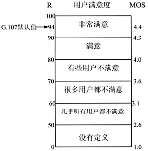 在ITU-T P.800中規(guī)定的平均主觀值MOS,基于該主觀評測把人接聽和感知語音質(zhì)量的行為被調(diào)研和量化,接聽到何種級別質(zhì)量的語音,就得到多少平均主觀值MOS。一般情況下MOS值是4或更高被認(rèn)為是比較好的語音質(zhì)量,而若平均主觀值MOS低于3.6,則大部分接聽者不能滿意語音質(zhì)量。平均主觀測試雖然準(zhǔn)確有效,但是這種方法存在的最大問題就是實現(xiàn)起來非常麻煩和昂貴,因此人們在不斷地探索能進(jìn)行客觀測量的方法。ITU-T的G.107標(biāo)準(zhǔn)提出的E模型考慮了延時、噪聲、回音、編碼器性能、丟包、抖動等網(wǎng)絡(luò)損傷因素對語音質(zhì)量的影響。它的評價標(biāo)準(zhǔn)如圖1所示。