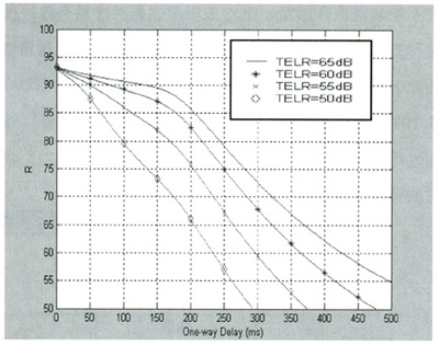 Datagram Protocol)協(xié)議進(jìn)行傳輸[1]。近年來,隨著IP網(wǎng)絡(luò)技術(shù)的廣泛應(yīng)用,VoIP成為一種新興的電話通信方式,IP網(wǎng)絡(luò)所提供的語音質(zhì)量問題受到人們的普遍關(guān)注,如何對語音質(zhì)量進(jìn)行科學(xué)可靠的測量和評價是網(wǎng)絡(luò)測量和網(wǎng)絡(luò)規(guī)劃設(shè)計中十分關(guān)鍵的問題。E-Model作為語音質(zhì)量測量的一種新方法,它適合數(shù)據(jù)網(wǎng)絡(luò)的語音質(zhì)量測量,必將有廣泛的應(yīng)用。本文將在E模型下分析延時、噪聲、回音和語音壓縮等對VoIP語音質(zhì)量的影響。