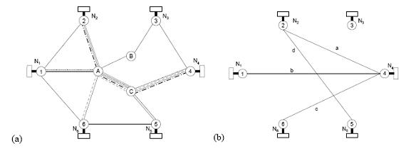 網(wǎng)絡拓撲如圖3(a)所示,以鏈路A-C為例,將通過鏈路A-C的端到端的呼叫分別表示為a, b, c, d,如圖3(b)所示, (i =