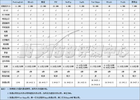 單獨安裝每一個軟件到測試系統(tǒng)中,查看文件大小。注冊帳號,順序測試軟件的每項功能,包括語音、視頻、文本及附加功能;在效果測試部分,測試每一個軟件PC-PHONE的語音效果,分別撥打固定電話及移動電話,測試兩端的語音效果。性能測試部分為記錄每款軟件在運行時的系統(tǒng)資源占用情況,包括內存使用和虛擬內存大小兩部分。