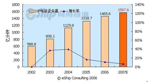 從圖中可以看出,國(guó)內(nèi)IP電話市場(chǎng)近年呈現(xiàn)出快速增長(zhǎng)趨勢(shì),2002-2007年年均增長(zhǎng)率為20.7%。預(yù)計(jì)2007年IP電話的通話時(shí)長(zhǎng)將達(dá)到1567.6億分鐘,同比增長(zhǎng)7%。但從2005年開(kāi)始,IP電話的增長(zhǎng)率呈下降趨勢(shì),這主要是受管制限制和移動(dòng)長(zhǎng)途的替代作用所致。