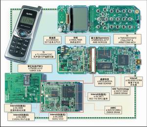 Wi-Fi功能由科勝訊(Conexant)的Prism3 802.11b芯片組完成,是一款傳統(tǒng)的專業(yè)方案?苿儆嵧ㄟ^(guò)收購(gòu)GlobeSpan-Virata得到Prism3 802.11b,而GlobeSpan-Virata之前購(gòu)買(mǎi)了Intersil的Wi-Fi芯片組業(yè)務(wù),所以Prism3組件仍打著Intersil的標(biāo)識(shí)。以目前的標(biāo)準(zhǔn)看,Prism3總體Wi-Fi方案的集成度不算太高。ISL3871基帶/媒體存取控制芯片與ISL3684收發(fā)器相連,一款獨(dú)立的壓控振蕩器和一個(gè)RF功放(ISL3084和ISL3984)共同支持ISL3684完成工作。適中的256KB SRAM和128KB閃存滿足該設(shè)計(jì)中802.11b部分對(duì)存儲(chǔ)器的需要。