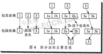 如果某個RTP包在傳輸過程中丟失,那么丟失的只是原數(shù)據(jù)包按采樣間隔的一半信息,接收端可以用接受到的另一半信息,利用插值等方法恢復(fù)出原話音包的大部分信息,從而使話音質(zhì)量不至于下降太多。拆分法的主要思想如圖4所示。