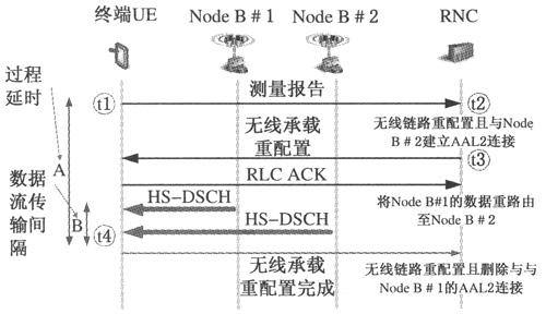 對(duì)于下面的延時(shí)分析,我們假設(shè)信令無(wú)線承載(SRB)在下行映射到HS-DSCH信道上,在上行映射到增強(qiáng)上行鏈路專用信道(E-DCH)上,且TTI均為10ms。HS-DSCH是HSDPA的傳輸信道,E-DCH是HSUPA的傳輸信道。首先,當(dāng)滿足測(cè)量觸發(fā)事件1d(最優(yōu)小區(qū)改變)時(shí),UE在信令無(wú)線承載上發(fā)送測(cè)量報(bào)告。傳輸從t1開始,RNC在t2時(shí)刻接收到消息。服務(wù)RNC將為目標(biāo)NodeB保留基站資源和Iub資源。該資源的預(yù)留通過(guò)使用預(yù)配置可以完成得非常快。一旦資源在t3時(shí)刻準(zhǔn)備好,RNC將向UE發(fā)送無(wú)線承載重配置消息,此時(shí)UE還是從源NodeB中接收數(shù)據(jù)。當(dāng)UE對(duì)重配置消息進(jìn)行解碼,并且在有效時(shí)刻t4到期前,UE接收數(shù)據(jù)將從源小區(qū)切換到目標(biāo)小區(qū)。UE開始監(jiān)聽目標(biāo)小區(qū)的高速共享控制信道(HS-SCCH),HS-SCCH是HSDPA下行的共享控制信道。UE也會(huì)測(cè)量目標(biāo)小區(qū)的信道質(zhì)量,并發(fā)送目標(biāo)小區(qū)的CQI報(bào)告。源小區(qū)該用戶的MAC-hs在小區(qū)切換后將重置,并將緩存的協(xié)議數(shù)據(jù)單元(PDU)刪除。同時(shí)目標(biāo)小區(qū)MAC-hs中的流控單元開始從服務(wù)RNC中請(qǐng)求PDU,這樣便可以通過(guò)HS-DSCH向用戶發(fā)送數(shù)據(jù)。在小區(qū)切換過(guò)程中,RNC可以同時(shí)向兩個(gè)Node