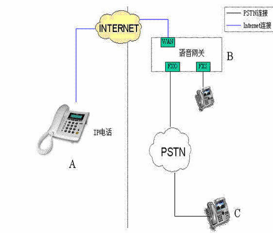 反之如果B點的當(dāng)?shù)仉娫捰脩鬋,透過電話撥接到B點的FXO口,然后利用INTERNET網(wǎng)絡(luò)轉(zhuǎn)接回A點,這就是上車。