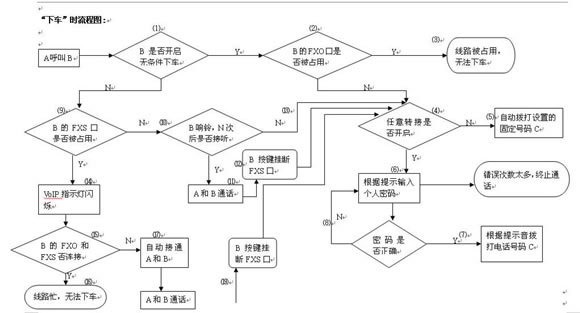 - 若A是為了下車,則B端接聽方按鍵“*#*”切斷FXS通路,然后進(jìn)入⑷--⑻。