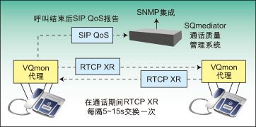 圖2顯示了如何在IP網(wǎng)絡(luò)上使用行業(yè)標準覆蓋質(zhì)量管理系統(tǒng)。圖中顯示了嵌入式軟件探測裝置,如IP話機中的行業(yè)標準VQMon代理,它們可實時監(jiān)測通話質(zhì)量。這些代理可生成RTCP