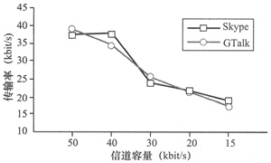 kbit/s時,GTalk發(fā)生了很明顯的變化,傳輸速率降低到了35 kbit/s。這個變化使得其PESQ MOS分數(shù)與Skype相比有所提高,而Skype的傳輸速率則接近信道容量。當信道容量變?yōu)?0
