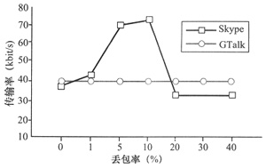 MOS分數(shù)的下降。另一方面,Skype在有較高時,傳輸率有明顯的下降,導(dǎo)致業(yè)務(wù)質(zhì)量更糟。