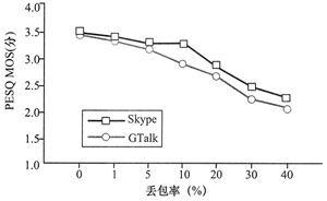 ms、100 ms時Skype的PESQ MOS高于GTalk,在時延為500 ms、1 000 ms時GTalk則略優(yōu)于Skype。