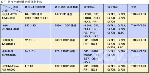 結(jié)合表2中的數(shù)據(jù),可以看出國(guó)內(nèi)中繼媒體網(wǎng)關(guān)設(shè)備制造商的定位非常類(lèi)似于軟交換設(shè)備的市場(chǎng)定位,從設(shè)備支持的最大E1數(shù)和最大DSP通道數(shù)來(lái)看,華為和中興的中繼媒體網(wǎng)關(guān)主要是面向運(yùn)營(yíng)商客戶,不難發(fā)現(xiàn)網(wǎng)關(guān)支持的協(xié)議也最為豐富,能夠滿足和運(yùn)營(yíng)商不同協(xié)議體系網(wǎng)絡(luò)互通的需要。而大唐高鴻、星網(wǎng)銳捷和邁普的中繼媒體網(wǎng)關(guān)主要定位在企業(yè)行業(yè)客戶。