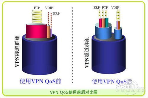 一般情況下VPN線路帶寬所表現(xiàn)出來的時大時小、斷斷續(xù)續(xù)、甚至中斷等等不夠用或不穩(wěn)定的情況,在使用VPN QoS以后可得到根本的好轉,它可以對VPN總體帶寬進行大小分配,進行優(yōu)先而穩(wěn)定的保證。有了足夠的VPN線路帶寬,才能快速的進行VoIP、ERP等應用。因此保證VPN整體帶寬是VPN應用的基礎。
