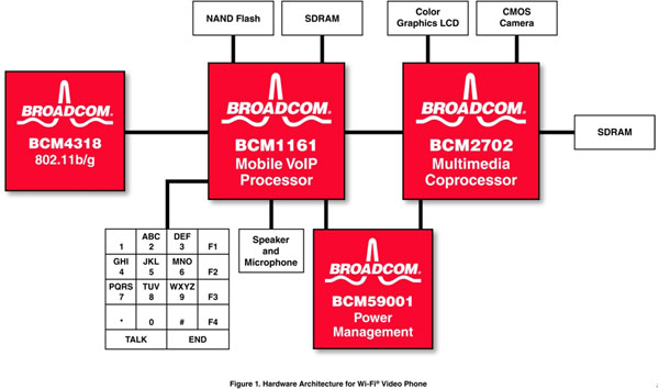 該方法的一個(gè)例子如圖1所示。該方案支持接入到本地?zé)o線網(wǎng)絡(luò)的Wi-Fi 接口上的全雙工語(yǔ)音和視頻,它已經(jīng)有了成功的實(shí)現(xiàn)案例,并計(jì)劃用于一款新型的消費(fèi)產(chǎn)品設(shè)計(jì)。所有高級(jí)的呼叫建立和管理、音視頻同步以及應(yīng)用層都在一片BCM1161 VoIP器件上運(yùn)行。為實(shí)現(xiàn)這些功能采用了一片嵌入式通用ARM926E RISC CPU,還有一片嵌入式DSP用于音視頻編解碼和回波消除。利用一個(gè)BCM4318E 802.11b/g Wi-Fi無(wú)線網(wǎng)絡(luò)接口,BCM1161提供了為實(shí)現(xiàn)一個(gè)具有成本效益的Wi-Fi手機(jī)的語(yǔ)音所需的全部功能。